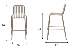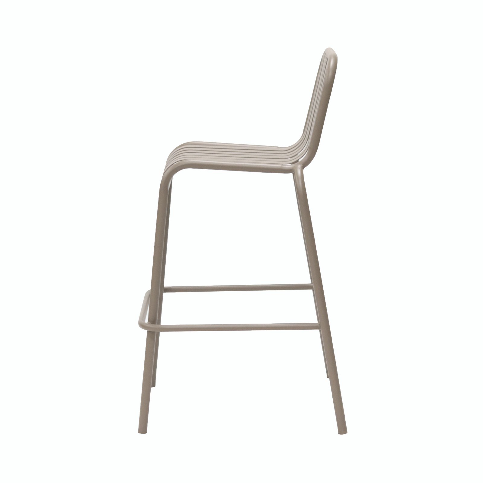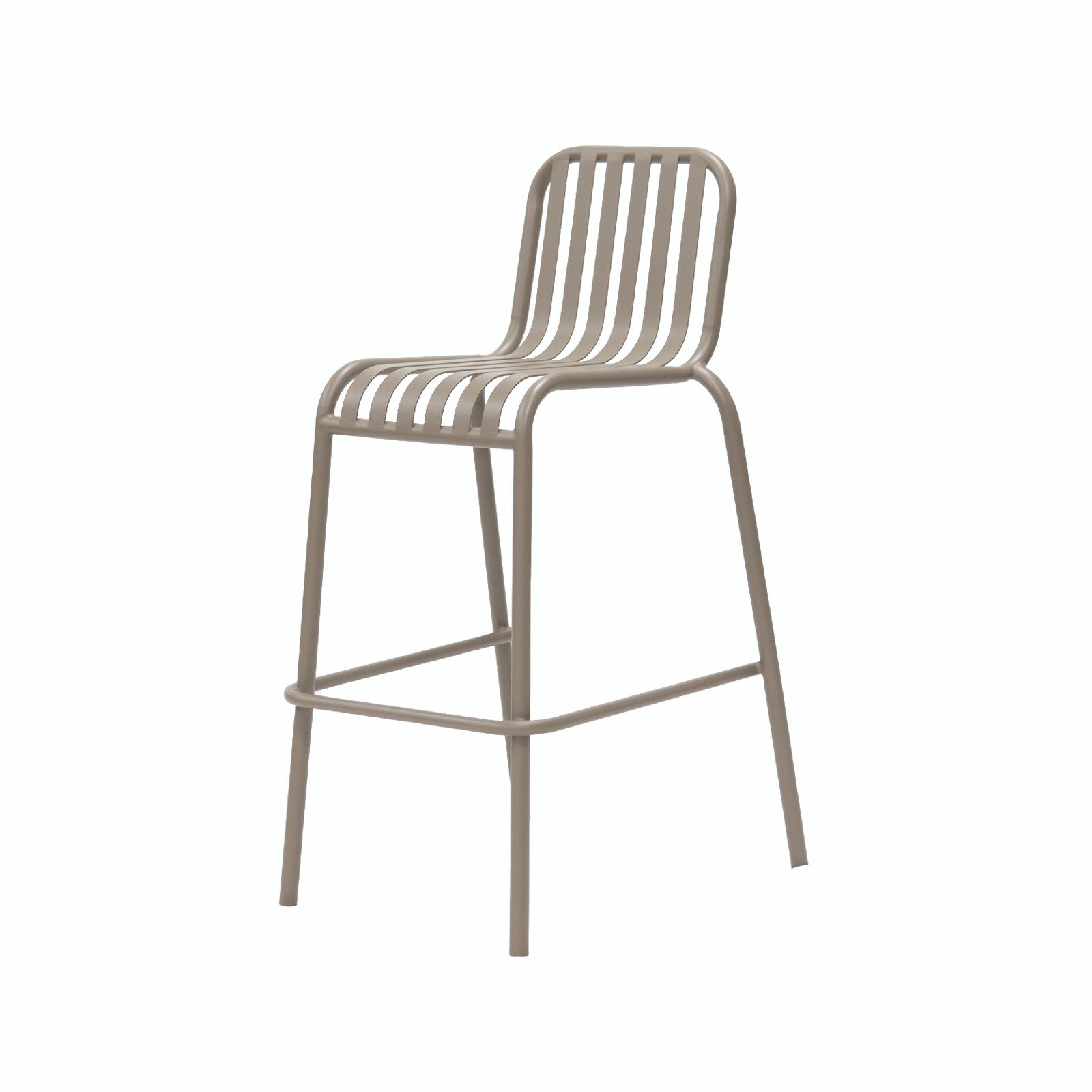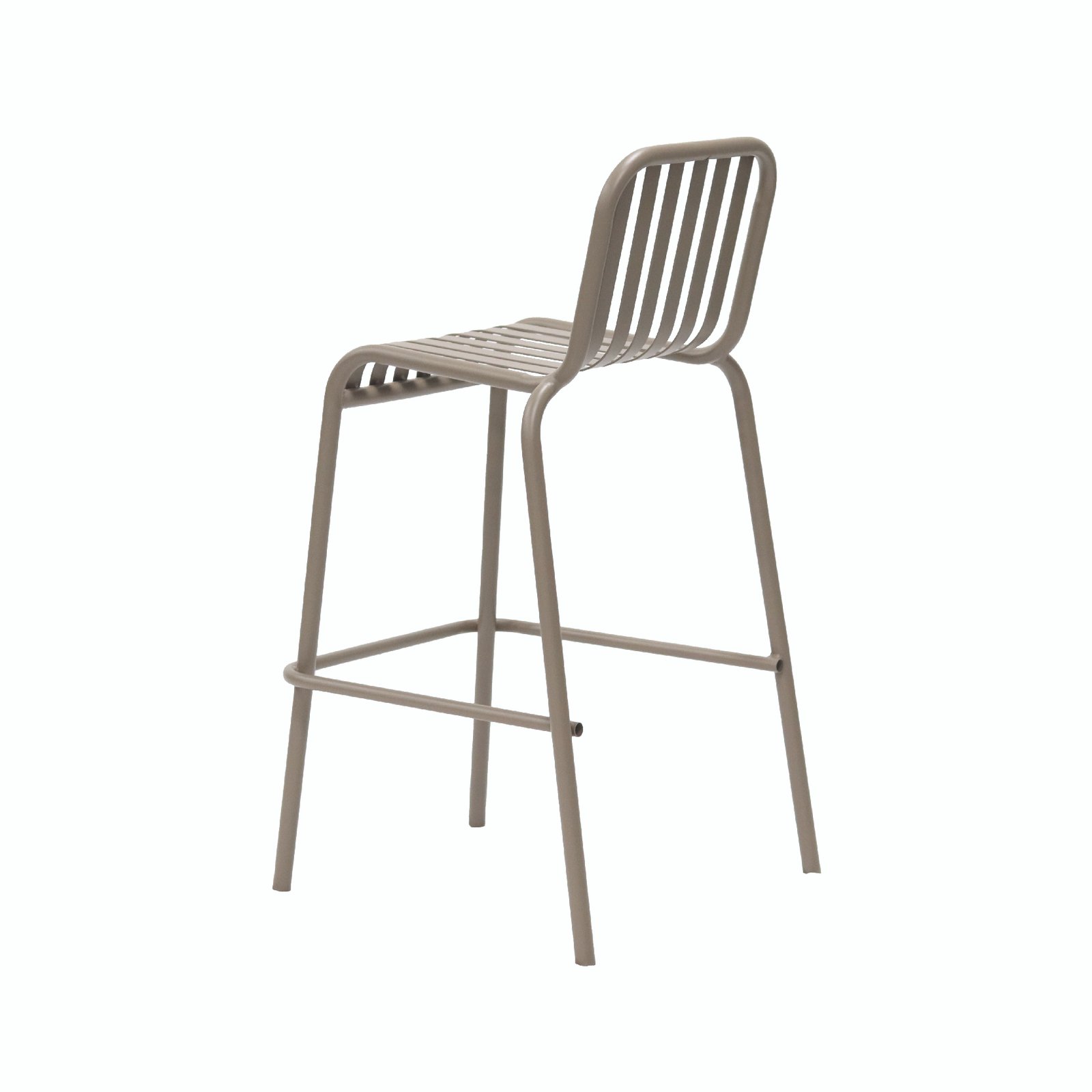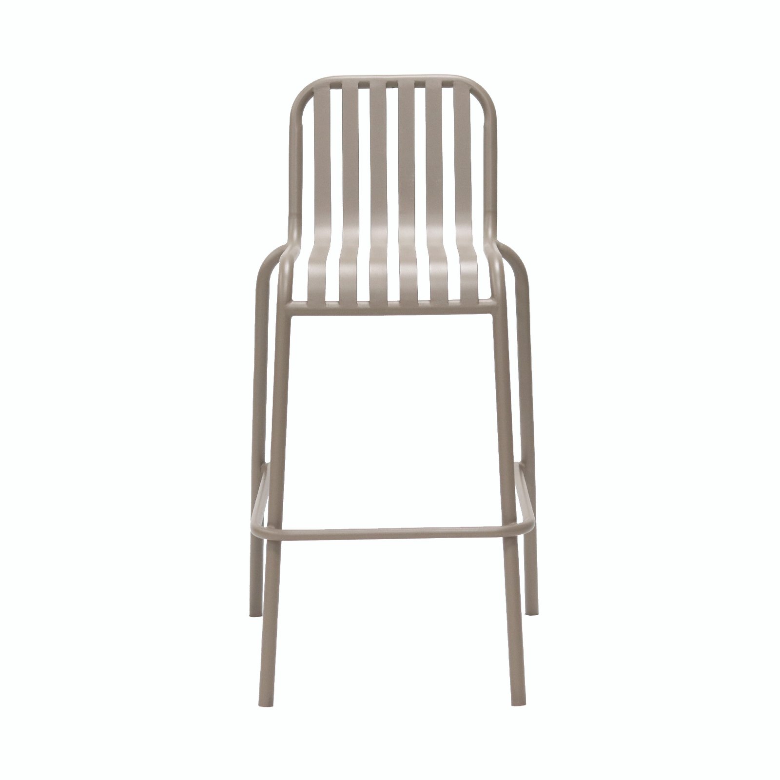 The backrest and seat surface are made up of multiple parallel – arranged metal bars, with smooth lines. The backrest is slightly tilted, conforming to the curve of the human back to provide a comfortable leaning experience. The legs of the chair are slender yet sturdy, and there is a horizontal bar at the bottom, enhancing the stability of the chair. With a simple and modern overall design, it is suitable for matching with a bar counter or a taller dining table, and can be used in places such as home kitchens and cafes.