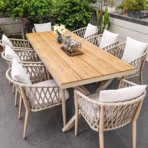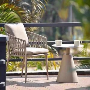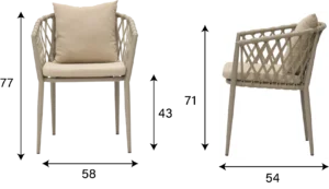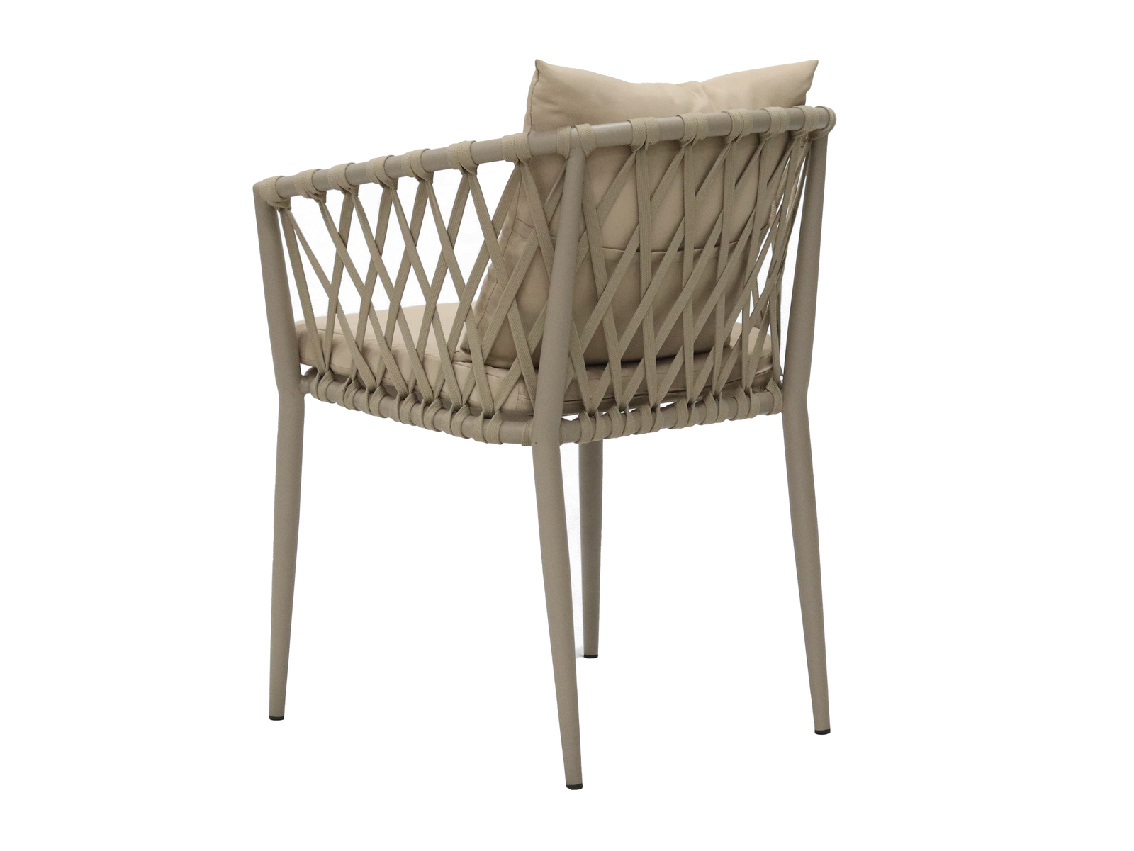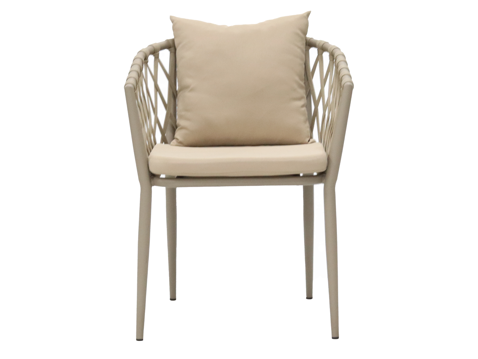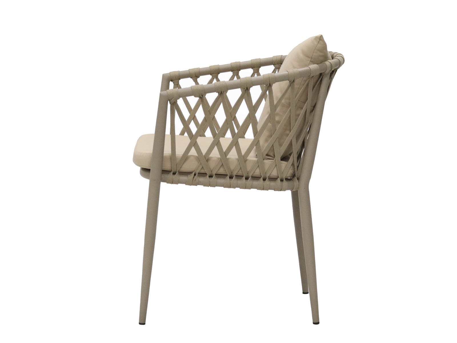 This is a modern-style lounge chair. The frame of the chair is made of light gray material. The backrest and armrests feature a woven design, presenting a diamond-shaped grid pattern, which adds a touch of natural and artistic charm. It comes with a beige seat cushion and a throw pillow. The materials look soft and comfortable. It is suitable for placement on balconies, gardens, or indoor leisure areas, providing a cozy sitting experience.