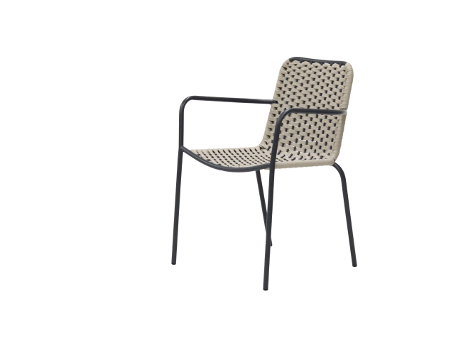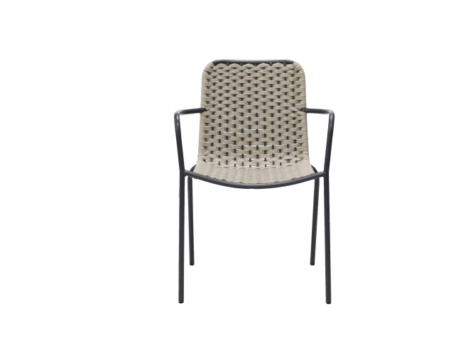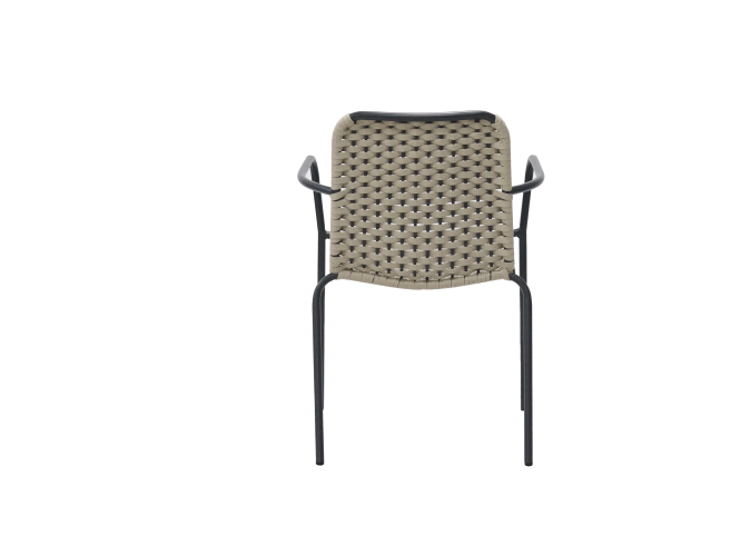 The frame is made of black metal with smooth lines, providing a stable support for the chair. The seat and backrest are crafted from beige woven material, with evenly spaced weaving patterns, presenting a natural and rustic style. This design makes it suitable not only for the leisure areas of indoor homes, such as balconies and living rooms, but also for outdoor spaces like courtyards. It combines aesthetics and practicality, adding a relaxed and cozy atmosphere to the space.